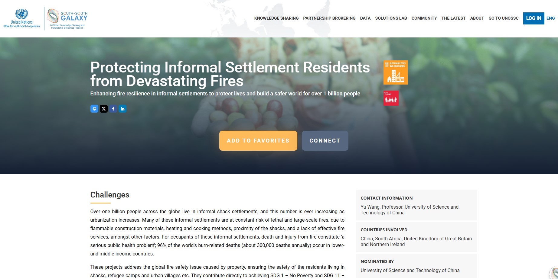 Recently, the fire safety resilience research on informal settlements (such as slums, refugee camps and urban villages, etc.) jointly conducted by the University of Science and Technology of China (USTC), University of Edinburgh (UK) and Stellenbosch University (South Africa) was selected by United Nations Office for South-South Cooperation (UNOSSC) as a Good Practice in South-South and Triangular Cooperation. This research was officially featured as a Solution on South-South Galaxy (UNOSSC’s global knowledge-sharing platform) on the 10th of November. UNOSSC presents Good Practices as great examples of South-South and triangular cooperation that showcase innovative, impactful, and scalable solutions, demonstrating collaborative efforts among countries of the Global South as well as supported through triangular cooperation involving traditional donors, multilateral organizations, and developed countries. This is the first Good Practice and Solution on the keyword of “Fire Safety” by the UNOSSC, and the first time our university's research results have been selected.